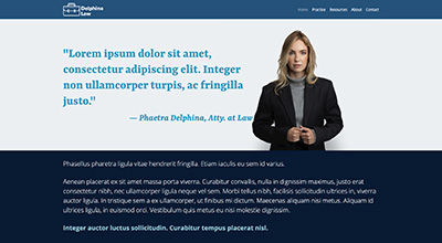 A fictional solo law office specializing in personal injury cases. The deliberate but striking color scheme, the images of the owner, and a few tricks with image parallax are designed to promote trust and engagement.